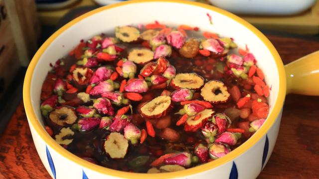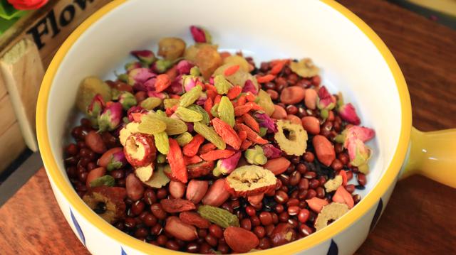 主要食材:红米、血糯米、红豆、枸杞、桂圆、玫瑰花、红糖、葡萄干