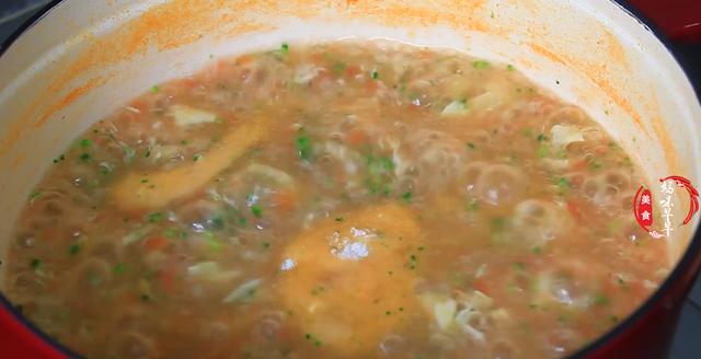 第六步、煮到汤汁变得稍微粘稠一些,然后加入一个鸡蛋液,用筷子迅速搅拌均匀,再把切碎的西蓝花倒进去煮上几秒钟,最后加入适量盐搅拌均匀就可以出锅了。