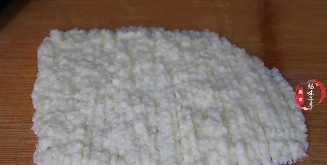 第二步、然后我们先把山药拍扁,然后用刀背把它剁碎,继续剁成山药蓉,越细口感越好,剁好后装入盘子里备用。