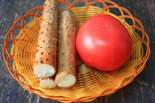 第一步,首先准备一个西红柿,给它划上十字刀,然后倒入开水浸泡,这样去皮比较容易,山药去掉外皮,山药可以用开水烫一下,这样去皮手就不痒了。