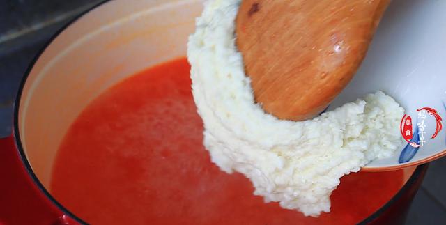 第五步、锅里倒入食用油,油热后倒入西红柿翻炒,把西红柿的汁水炒出来,加上一勺盐增加一些底味,接着加入足量清水,搅拌均匀后大火煮开,然后倒入山药蓉,山药蓉会黏在一起,把它们充分的搅散开。