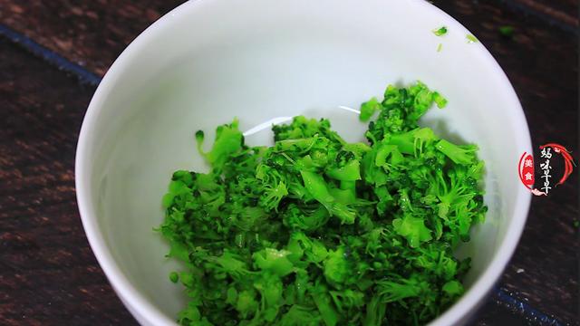 第三步、小锅里烧点水,水开加几滴油,然后把西蓝花焯一下,时间不要长,十几秒就可以了,焯好的西蓝花放到案板上切成碎末备用。