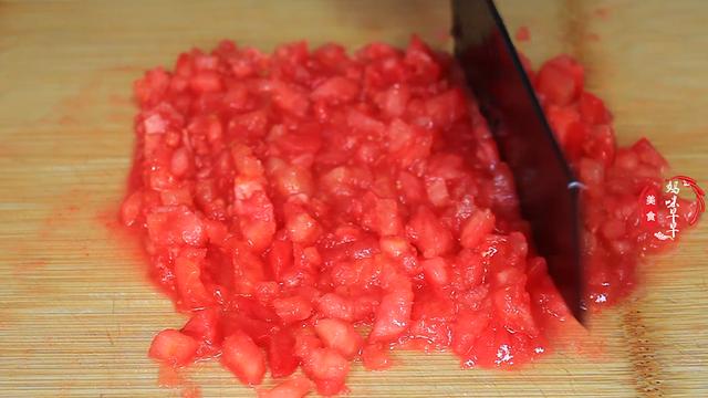 第四步、这个时候西红柿也烫好了,咱们把外皮撕掉,再把根部切掉,先把西红柿切成小块,然后再剁碎,剁好后装入碗中。