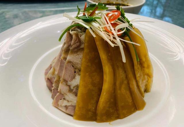 这道菜可是我们陕西宝鸡的特色菜,上好的肘花肉加上皮冻,然后浇上酸香的油醋汁,吃起来特别爽口,肉下面还会放上一些豆芽,尤其是喝酒时,这道菜可是绝好的下酒菜。