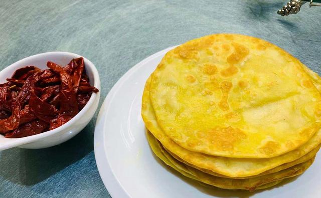 陕西人的特色小吃,金黄色的油饼,卷上酸辣爽口的红辣椒,吃一口就停不下来,这个辣椒其实一点也不辣,反而酸味更重一些。