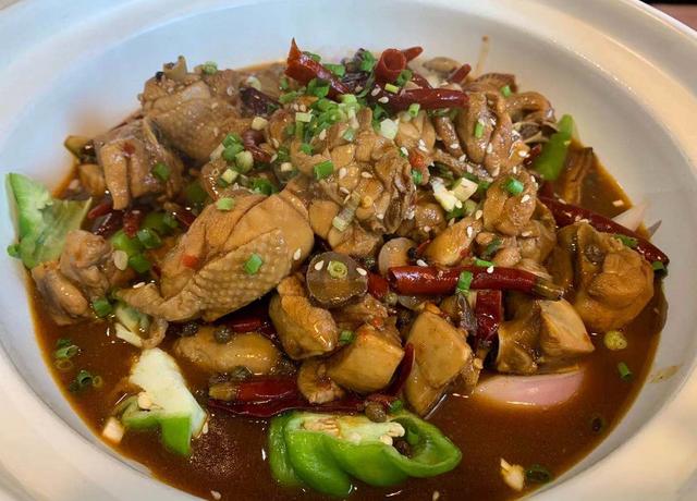 鸡肉用的是鸡腿,辣味较重,肉比较嫩,如果配上一碗面片拌在里面,那一定是最诱人的吃法。