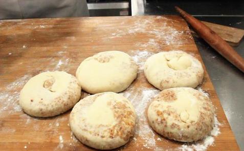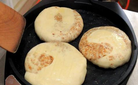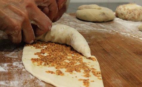 把边沿和底端的张口捏住、避免露马脚。拉着面剂的两边、略微抻长一点儿叠成饼坯,用这类方式作出的饼,层级更为丰富多彩。随后把饼坯挤扁,封口夯实预留。