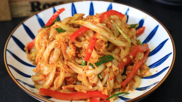 3、沙水之后挤干水分,不用冲洗,加入葱段、红椒丝、蒜末、白芝麻、辣椒面用热油激发出香味,加生抽、香醋、蚝油抓拌均匀即可。