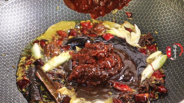 5、锅里倒点油,油热后把香料倒进去焯一炒,炒出香味后卤的骨头吃着更香,然后加入一大勺甜面酱,海鲜酱,豆瓣酱,将它们也完全炒出香味来,接着倒入炒好的糖色,加上一大勺的酱油和生抽,将调料翻炒均匀后,大火煮上3分钟,完全煮出香味之后就可以关火了。