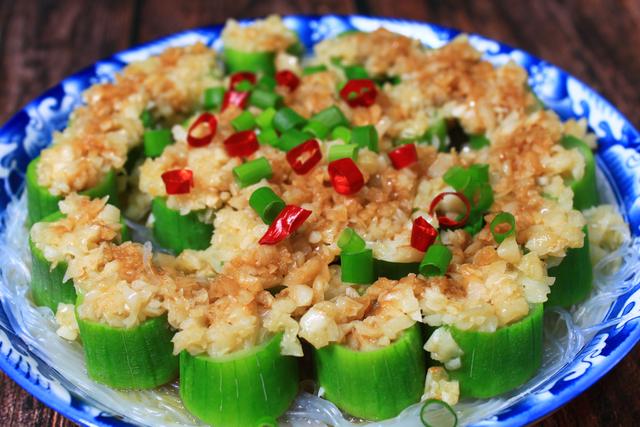 4,粉丝铺在盘子底部,接着摆好丝瓜,把蒜蓉铺在丝瓜上面,冷水上锅蒸10分钟。出锅后淋上蒸鱼豉油,撒上干红椒即可。