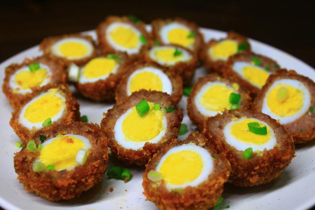 主要食材:鹌鹑蛋 猪肉馅 面包糠 葱姜 食用油