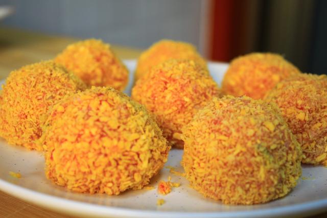 4、肉馅包裹好鹌鹑蛋后,再把肉丸子放入面包糠里面滚一滚,让丸子每一个部位都能均匀粘上面包糠。
