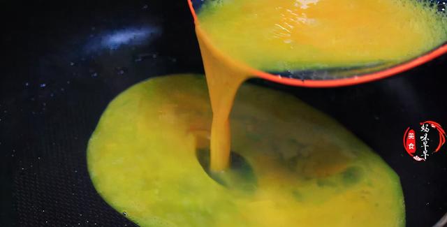 3、碗里打入4个鸡蛋,加一勺盐,充分地把鸡蛋搅散。然后再平底锅里薄薄地刷一层油,油热后倒入适量的鸡蛋液,把它摊成鸡蛋饼,两面金黄后就可以盛出备用了。