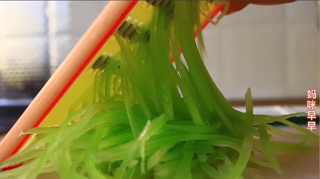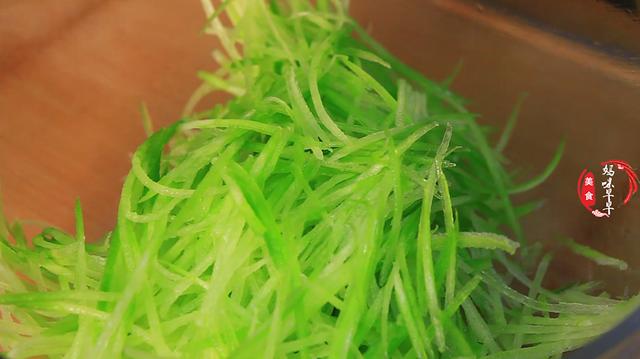 1,准备一个青笋去掉皮,然后插成细丝,锅里水开之后滴几滴食用油,把青笋焯一下水,这样青笋颜色更加翠绿。