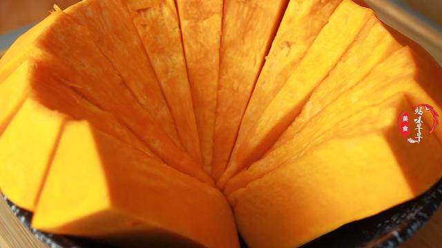 1、南瓜我们购买的时候选择有弧度的,这样的南瓜做出的成品,造型比较漂亮,将南瓜去掉外皮后,切成倒三角,顶部稍微尖一些,好摆造型。