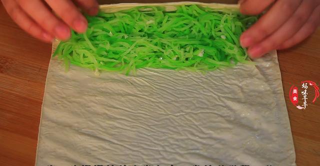 5、泡好的油豆皮铺到案板上,给它改一下刀,具体大小根据自家的平底锅而定,在一头放上拌好的萝卜丝,从一头慢慢地将它卷起来,卷的稍微紧一些,留一个边,把刚才准备的鸡蛋液刷上,这样能更好地粘合。