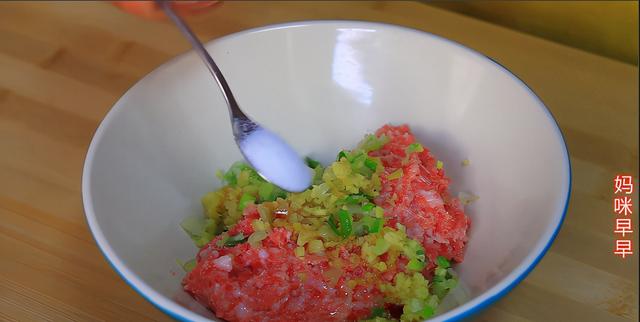 2、猪肉馅里面加入葱姜末,然后再放入料酒,生抽,盐,五香粉,搅拌均匀,腌制上10分钟。