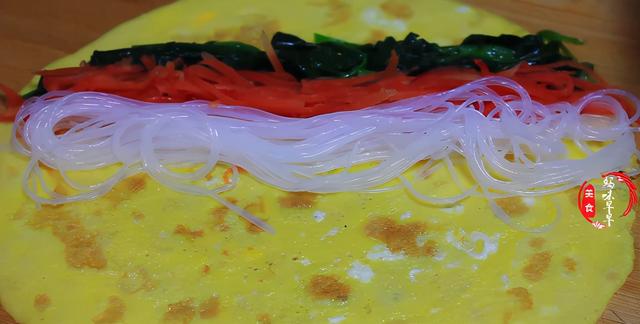 4、将鸡蛋皮铺在案板上,然后分别把菠菜、粉丝、菠菜铺在蛋饼的一头,慢慢地卷起来,卷的时候稍微近一些。