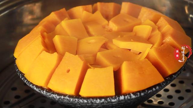 3、蒸好的南瓜,我们取出来,找一个盘子,将它倒扣过来,放在一边备用。
