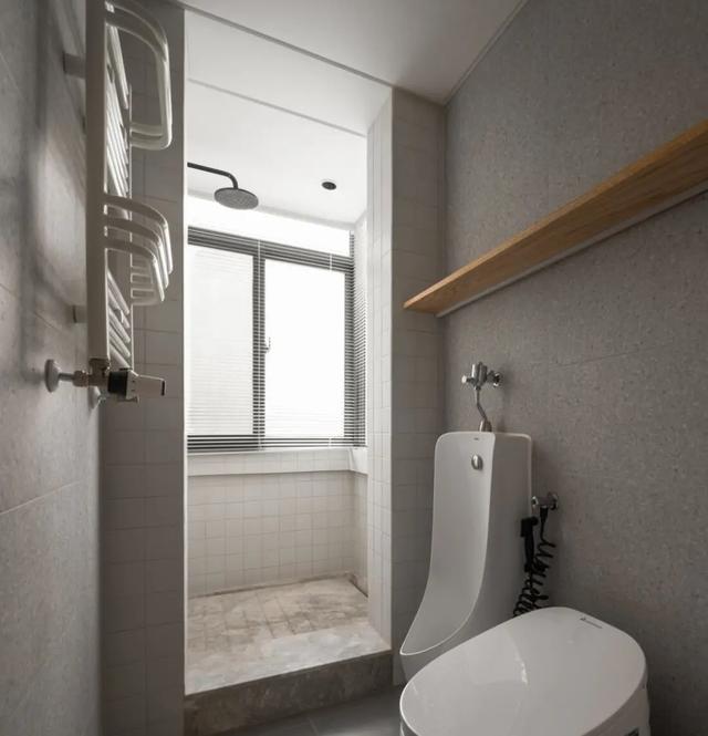 来到卫生间,借用北阳台空间规划的淋浴房,既是充分利用空间的体现,也保证了使用的舒适性。但是,在一个大家庭只有一个卫生间的情况下,单独的小便池可以再次保证空间的清洁卫生。