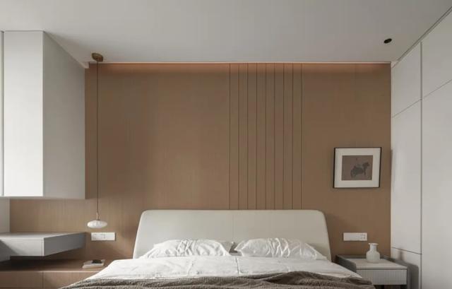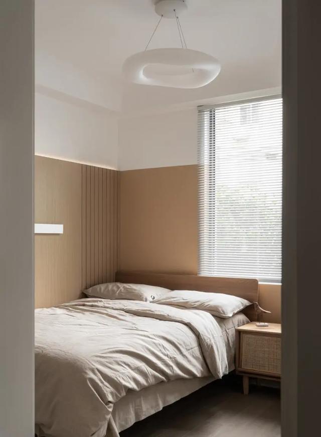 北面的小房间,目前大一点的孩子使用,整体延续了主卧的设计,保证了空间的统一性。考虑到床靠墙摆放,在墙上安装木饰面既保证了整洁度,又让孩子睡得更有包裹感。