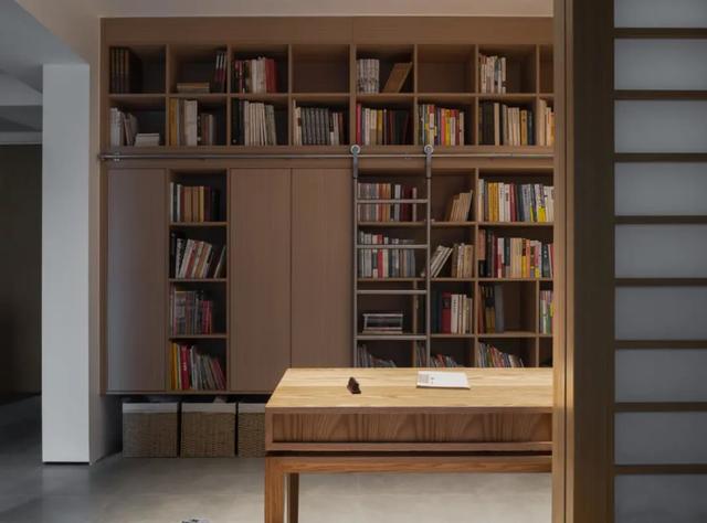 整面墙的书架设计可以说是整个房子的亮点之一,加上活动梯,收纳更加方便。同时,柜体底部的悬挂位置也可以用来存放一些物品,实现灵活使用。