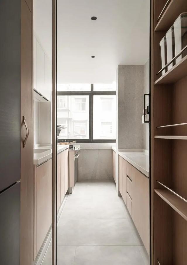 厨房包含北阳台时,整体分为两块设计,内部为日常烹饪和操作区,使公共区域与油烟完全隔离。而外面是杂物存放区和冰箱存放区。这样既方便了厨房的使用,也缩短了与餐厅的距离。