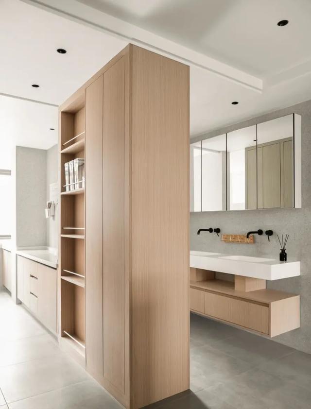 卫生间采用干湿分离的结构设计,干区配有双面盆,不仅提高了生活的便利性,而且采用挂盆结构让视觉更轻盈。同时墙面排水、壁挂式水龙头等设计再次弱化了复杂性,让空间更加整洁干净。