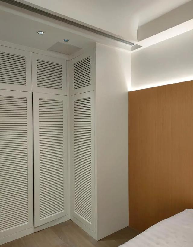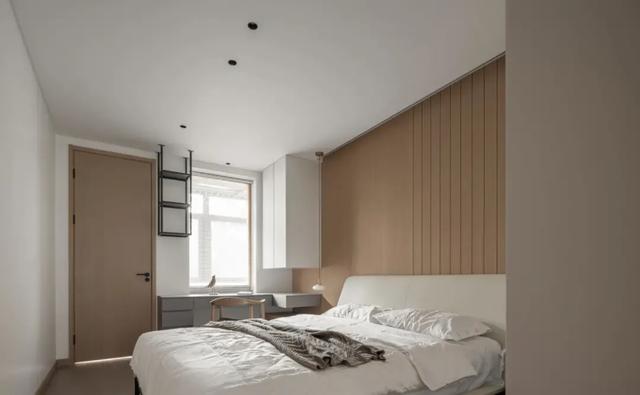 来到主卧,空间以白色和原木色为主,看起来清新淡雅。尤其是木质饰面床头的设计,拉伸了视觉高度。靠窗户设计的转角书桌给业主一个独立的办公区,与孩子的书房完全隔离。