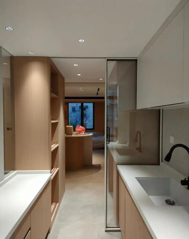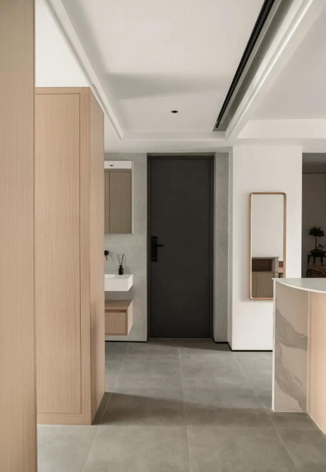 房子没有玄关,一眼就可以看到底,一进门就能让人视野开阔。空间布局方面,考虑到家中没有合适的鞋柜位置,将厨房和卫生间之间的柜子做成双面柜结构,解决基本的居住需求。同时右侧墙面的全长镜面配置也方便进出。