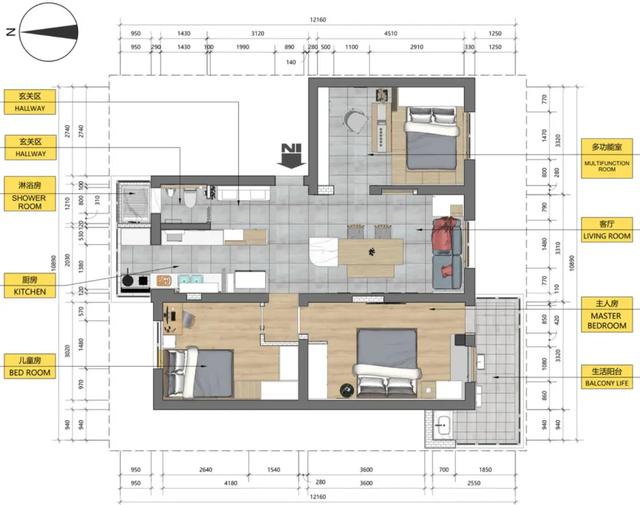 考虑到孩子比较小,不需要单独的房间,南边的第二间卧室定位为功能房。即便如此,独立的房间功能是为后期预留的。比如布局以自习室的功能为主,可以满足日常学习和阅读的功能。比如拉动推拉门后,内部就是一个独立的睡眠区。