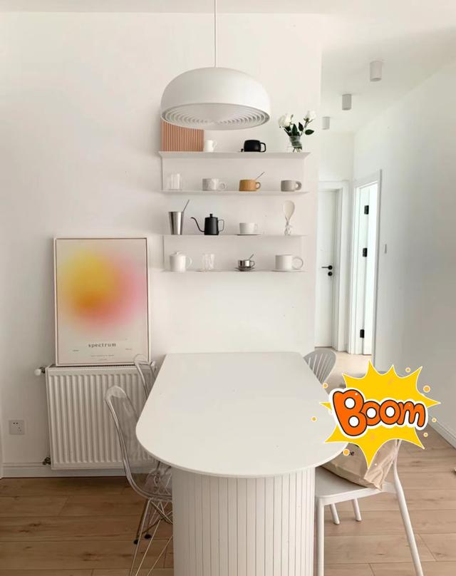 弧形的餐桌设计,很有设计感。白色的简约凸显了用餐环境的清新干净,让用餐也能有一个好心情,