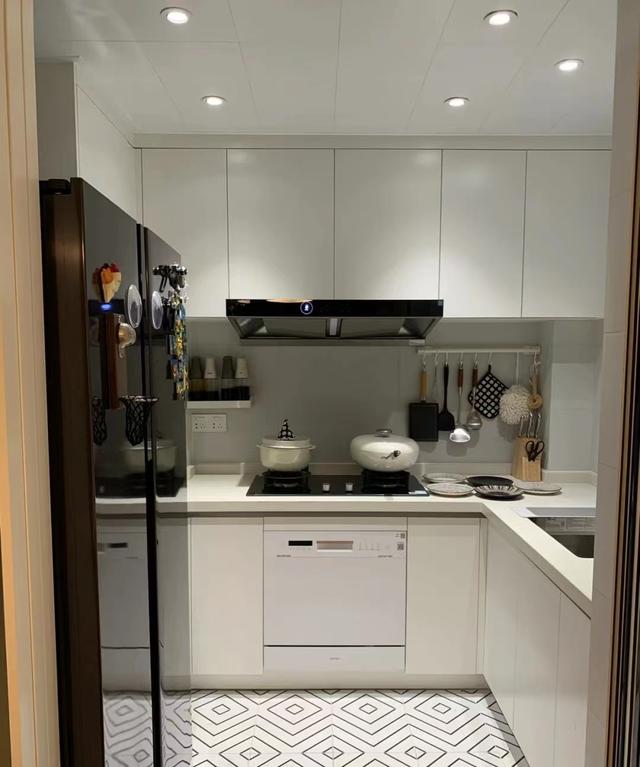 动线合理,操作流畅。地板由黑白瓷砖制成,非常线性,耐脏。定制的白色橱柜,无把手设计让立面更整体,视觉上更简洁更宽敞。
