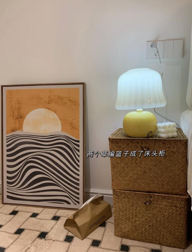床头柜采用两个草编筐,编织图案多样,美观大方,原料环保无污染,质感美观,承重可接受。放置台灯等物品没有问题,同时增加了床头柜的收纳空间。
