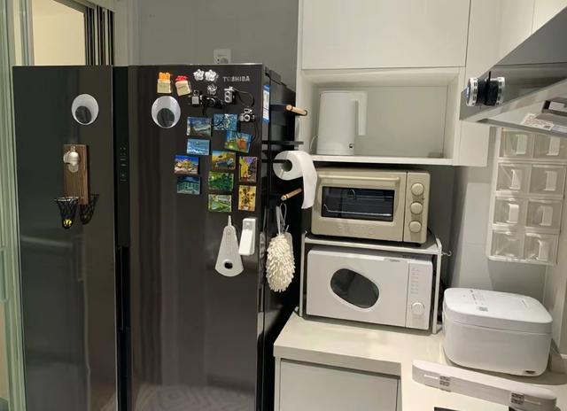 冰箱旁边的手术台上放了一个架子,用来存放微波炉等电器,非常结实实用。