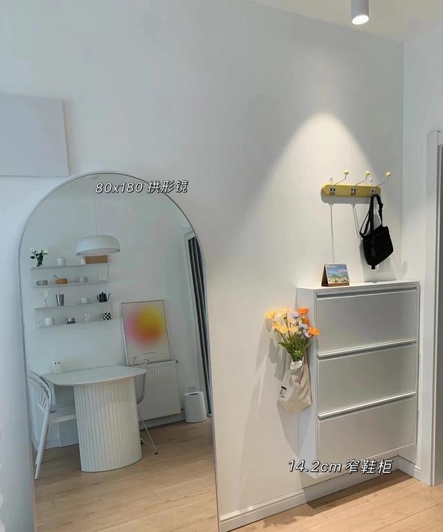 鞋柜旁边放置了一面80cmX180cm拱形全长镜,很有设计感,也是
