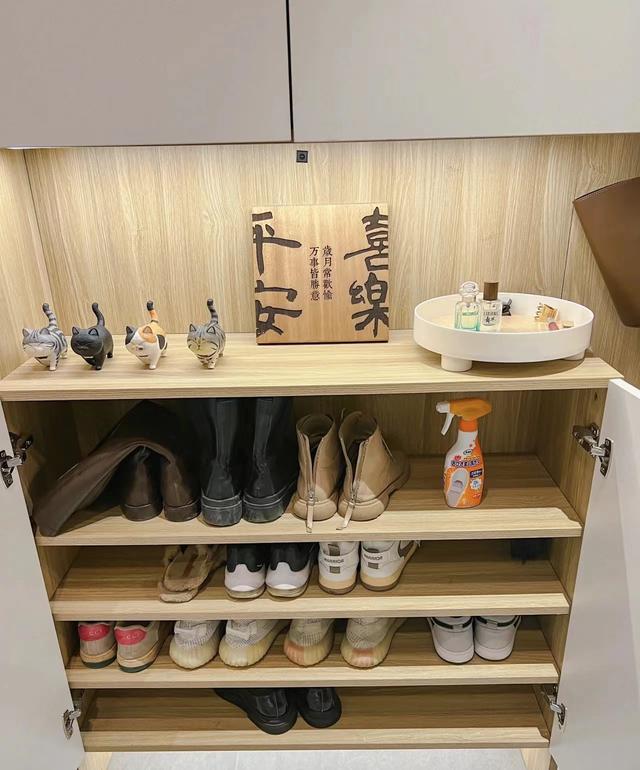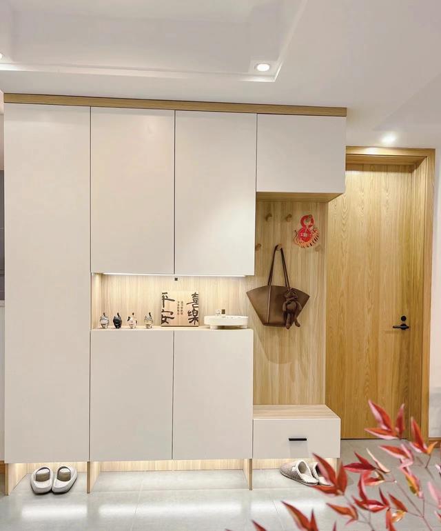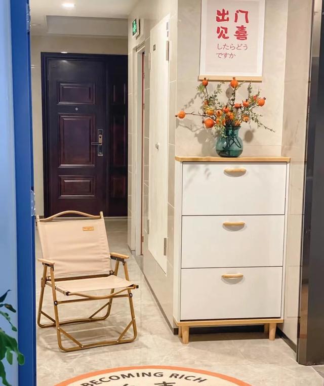 门口有一个超薄鞋柜,放平时穿的鞋子绰绰有余。小户型也可以放家里,窄窄的不占空间,配色也很温馨。