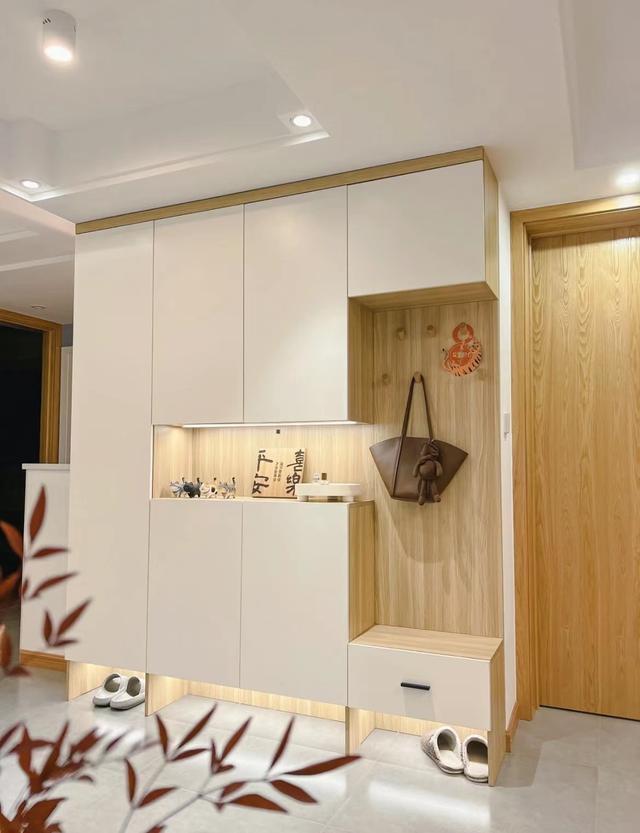 玄关柜是全屋定制的,灯带也是定制时预留的灯槽。之后嵌入灯带,更加方便我们的生活,无需触摸即可感应开灯。