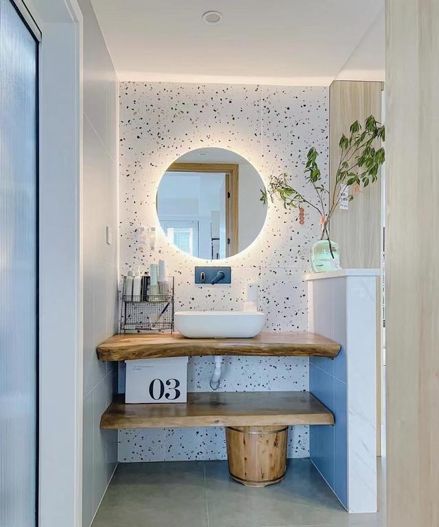 洗脸台的木板是定制的,经过防腐处理,不容易褪色受潮,也让家居设计感更强更高级。中间的镂空可以搭配储物篮,增加储物空间,遮住难看的水管。