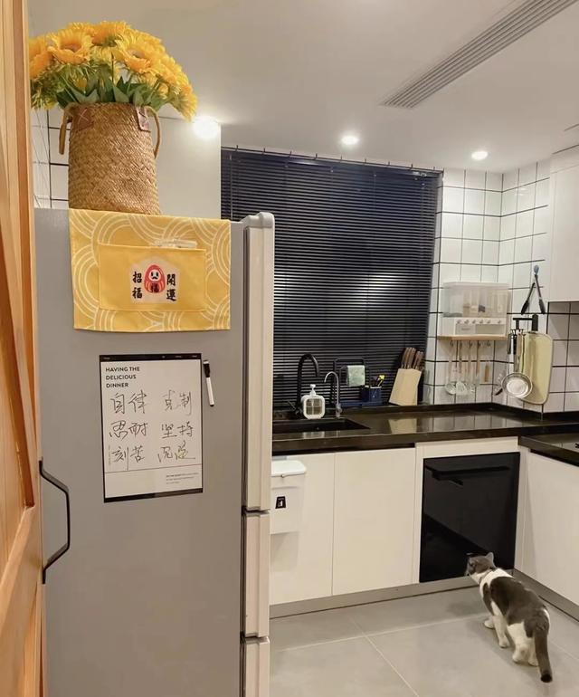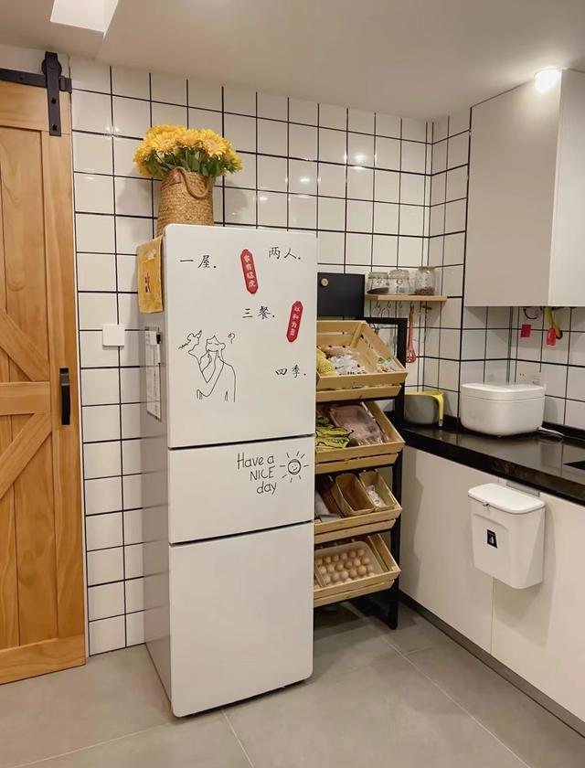 冰箱旁边放置了搁板,用来存放蔬菜、鸡蛋等菜肴,角落的空间也被利用起来,让厨房更加整洁有序。