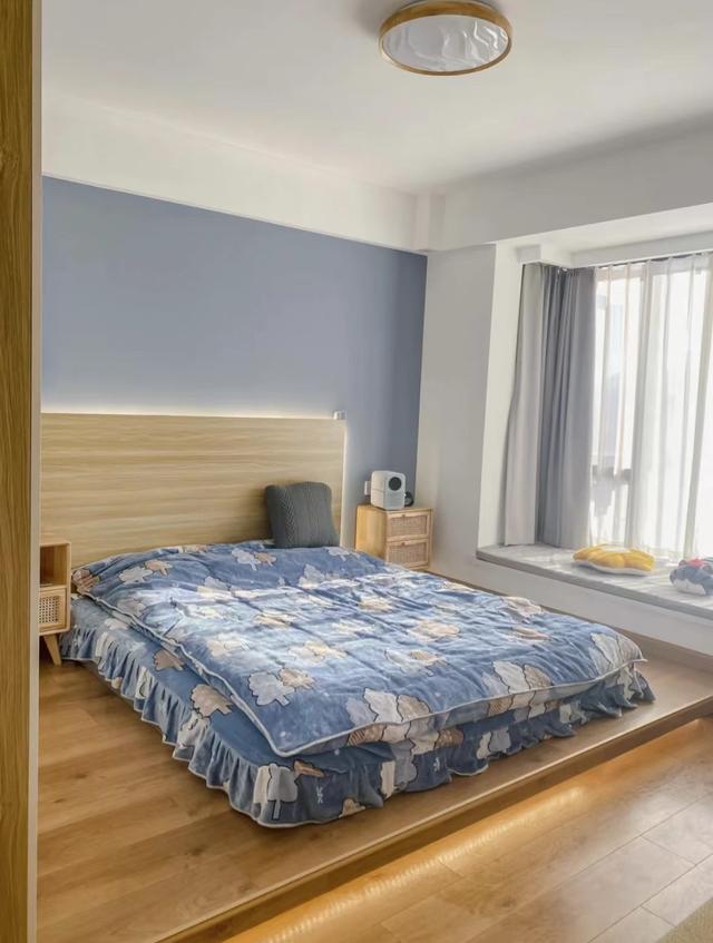 卧室设计了地板床,视觉上非常高级。卧室很温馨,不用花钱买床。你只需要买一个舒适的床垫,既节省了预算,同时又不占空间。既美观又实用,提高了家居的档次。