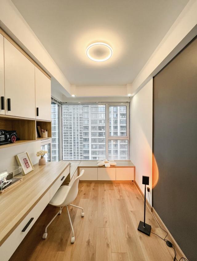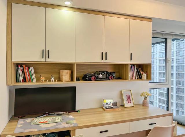 书房的柜子都是定做的,都是白原木。书桌2150*70cm挂在墙上,与飘窗相连。这张桌子完全可以容纳三个人。目前家里两个人,很空虚。