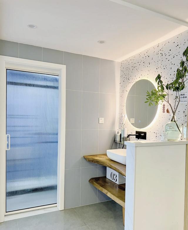 卫生间设计干湿分离,干区和湿区之间设计了长虹玻璃门。相对于通透性强但没有亮点的普通玻璃,长虹玻璃明显具有颜值碾压的优势,同时透光性好,隐蔽性恰到好处,是家居中的亮点。
