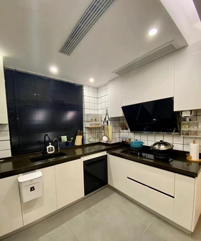 客用厨房铺的是亚光灰色瓷砖,最后铺出来的效果有点像水泥自流平,很满意,灰色也很好打理。哑光看起来很温柔,整体视觉感也很延展,让空间更加宽敞通透。
