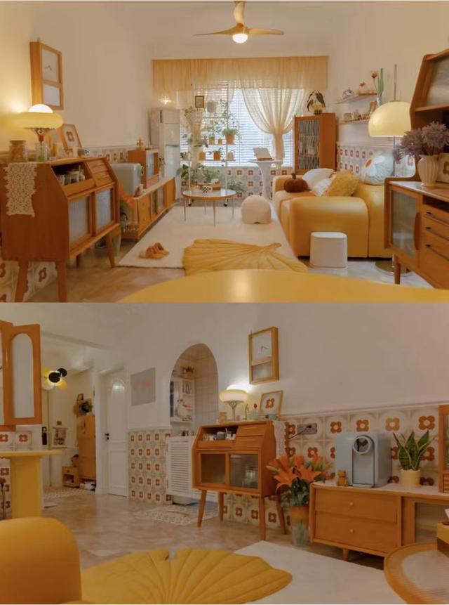 带有小红花的墙砖沿着整个公共区域的墙壁呈半墙状,使整个空间充满了童趣。黄色的小沙发看起来像几个蓬松的南瓜包子。我不知道是不是因为边肖饿了。反正看到这个沙发的第一反应不是舒适,而是看起来好吃。