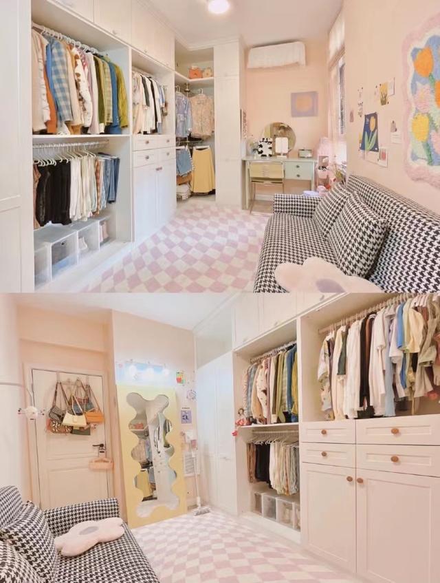 厨房对面是一个小卧室,因为是一人居住,所以两个房间都没有做成卧室,选择这个作为衣帽间,平时大部分时间都是作为衣帽间使用,在这里可以满足收纳东西和护肤化妆的需求。