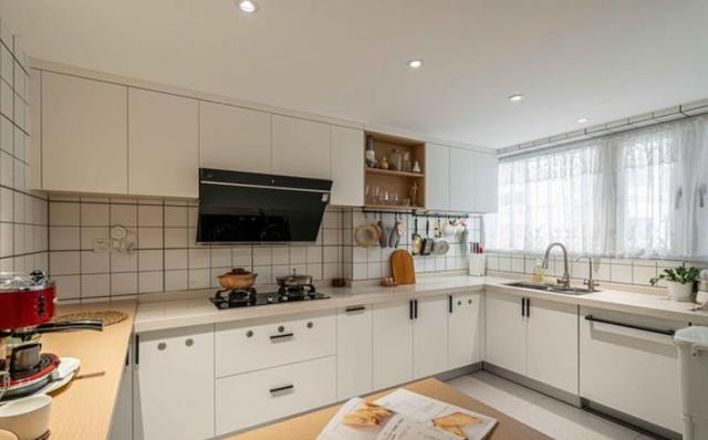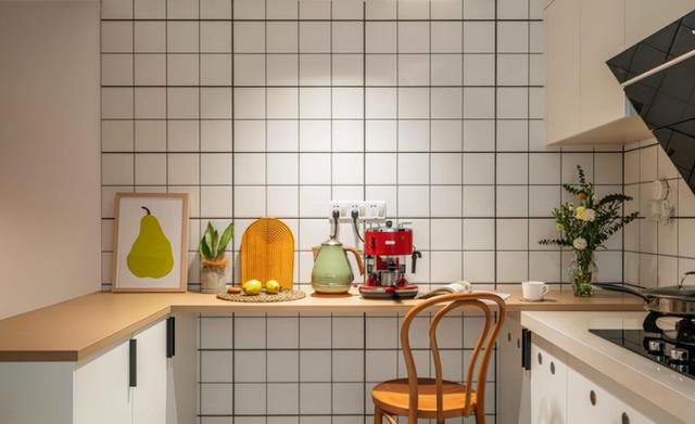 厨房隔断墙拆除后,引入了更多的自然光,面积增加了一倍,还增加了吧台功能,方便烹饪时操作。地面铺灰色地砖,搭配白色橱柜和小墙砖,给人一种干净整洁的外观,有一种北欧小资的风格,是全屋装修最成功的部分。