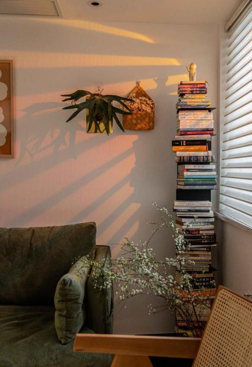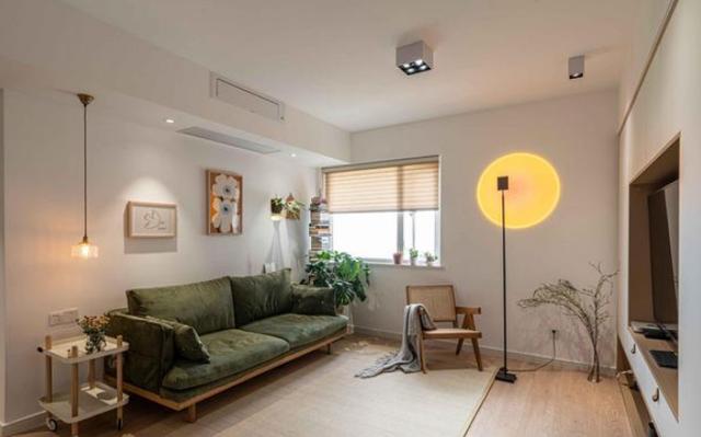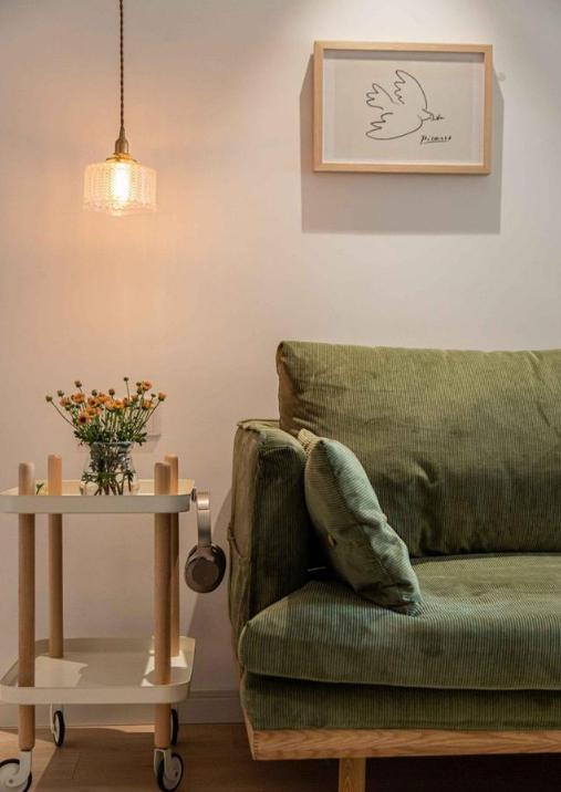 选择这组网上名人沙发,腿和外框都是实木的,离地12厘米,方便扫地机自由进出。搭配绿色灯芯绒,沙发富有触感和立体感,有一种休闲慵懒的气质,坐着相当舒服。木地板和米色乳胶漆墙,加上可移动的小边缘和复古吊灯,随手拍一张很漂亮。