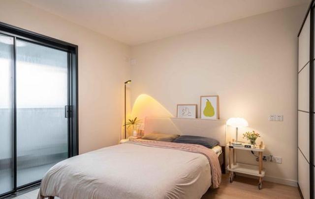卧室布局简单,生活功能相同,衣柜、墙壁、床上用品都统一在米色系,夕阳灯也开着,浪漫。推拉门采用长虹玻璃,黑色边框。你可以在床上看日出和日落。你可以尽情享受。你心情很好。你睡得很香,家庭自然和谐。阳台的一侧用作洗衣房。