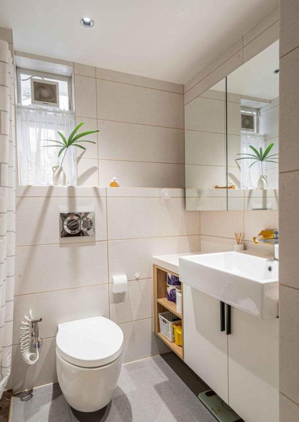 浴室也是浅色材质,让空间安静,价值高。淋浴房内的镜柜、水槽、壁龛方便放置洗漱用品。壁挂式马桶真的很方便清洁卫生。根据网红装修的实际情况,选择一两个元素,就不会踩坑了。